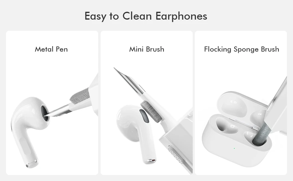 The headphone cleaning tool is designed with mini soft brush, sponge stick and metal pen, allowing for efficient and thorough cleaning of your headphones, making your headphones like new.